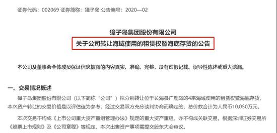 1月3日晚间,獐子岛公告称,拟分别转让位于长海县广鹿岛的4宗海域使用的租赁权暨海底存货,本次资产转让的交易价格是以评估值为参考,经过交易双方充分谈判协商而确定的,总价款合计为人民币10,050万元。