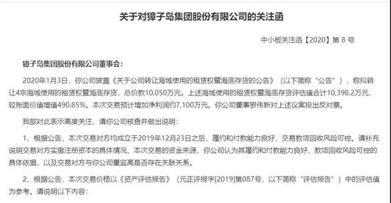 对于獐子岛要转让部分海域和海底资产,深交所也紧急发来关注函,要求獐子岛说明交易对方履约能力、评估价、是否存在障碍,并就董事反对提出的对经营影响和必要性和净利润计算等作出说明。