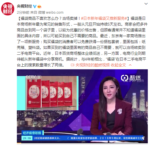 福袋是日本商场新年最为常见的销售形式,一般从元旦开始持续5天左右。商家会把多件商品放到同一个袋子里,以较为优惠的价格出售,但顾客通常并不知道福袋里面的具体内容,所以可能买到自己不需要的商品。最近,东京有一家商场推出了一项新服务:购买福袋的消费者可以免费获得一份捆包套装,里面包括:纸壳箱、塑料袋。如果买到的福袋里面有的商品自己不需要,就可以当场转卖到二手电商平台。近年,日本百货商场整体业绩低迷,另一方面,电商行业则期待能从新年福袋中分享商机。据统计,与4年前相比,“福袋”在日本二手电商平台上的搜索数量增长了两倍。