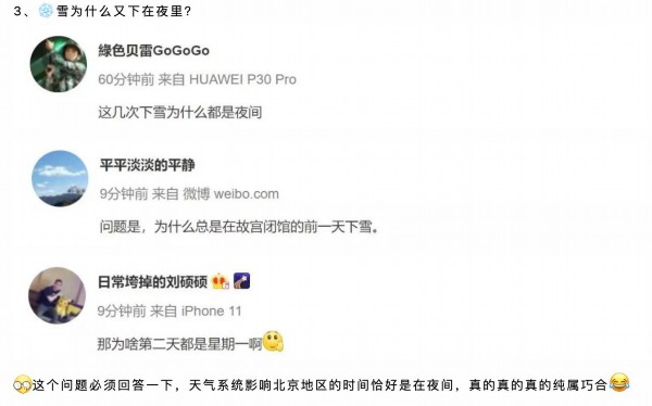 很多人爱去故宫赏雪,但故宫每周一闭馆,针对网友疑问,气象部门表示“这个问题必须回答一下,天气系统影响北京地区的时间恰好是在夜间,真的真的真的纯属巧合”。