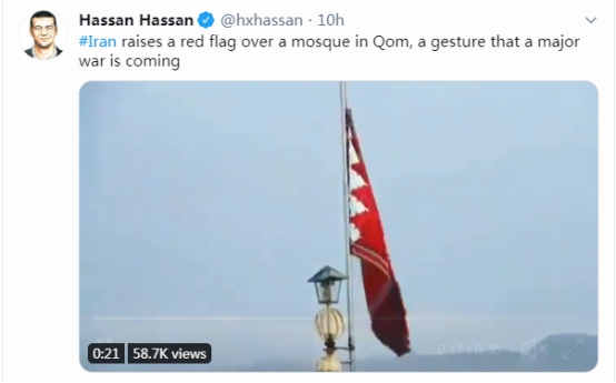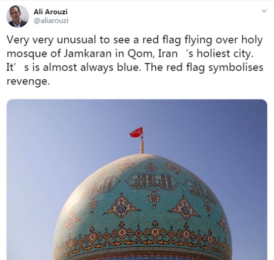 推特认证为美国全国广播公司(NBC)驻德黑兰记者的账号阿里(Ali Arouzi)还在推特上发布了清真寺悬挂红旗的照片,并表示此举“极不寻常”。他还表示,“红旗象征着复仇”。