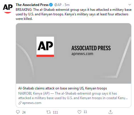 索马里极端主义组织“青年党”5日袭击了美国和肯尼亚军事人员使用的,位于肯尼亚沿海地区拉穆的一个军事基地。据美联社刚刚最新消息,肯尼亚军方表示,至少4名袭击者被杀。