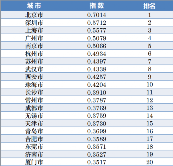 此次中国城市科技创新发展指数排名前20位依次是:北京、深圳、上海、广州、南京、杭州、苏州、武汉、西安、珠海、长沙、常州、成都、无锡、天津、青岛、合肥、东莞、济南、厦门。