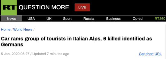 报道称,这起意外发生在意大利北部的一个名叫卢塔戈的小山村,靠近与奥地利接壤的位置。6名死者均当场死亡,还有一些人受伤严重。当地警方通报了死者的国籍。