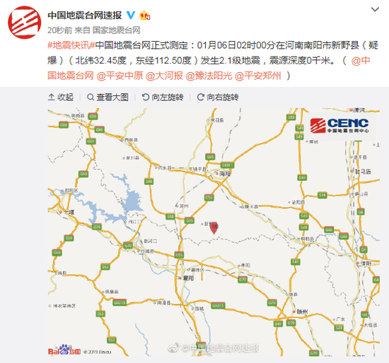 荔枝新闻讯 中国地震台网正式测定:01月06日02时00分在河南南阳市新野县(疑爆)(北纬32.45度,东经112.50度)发生2.1级地震,震源深度0千米。