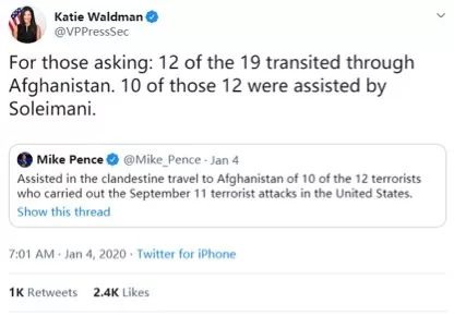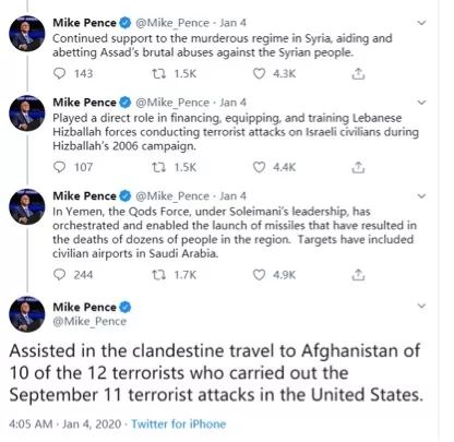 根据多家美国媒体的报道,彭斯是在他的个人社交账号上发帖列举苏莱马尼的一系列“罪行”时,提到了苏莱马尼与9•11恐怖袭击事件的关联的。