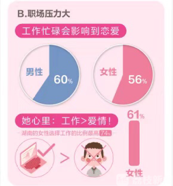 婚恋观报告显示:职场男性的孤单指数为77,女性为66,其中主要归结于“单身”和“忙于工作”。在大多数职场单身们看来,工作与恋爱是难以相互兼顾的,其中60%男性和56%女性认为工作忙碌会影响到恋爱,认为不影响的仅有两成。
