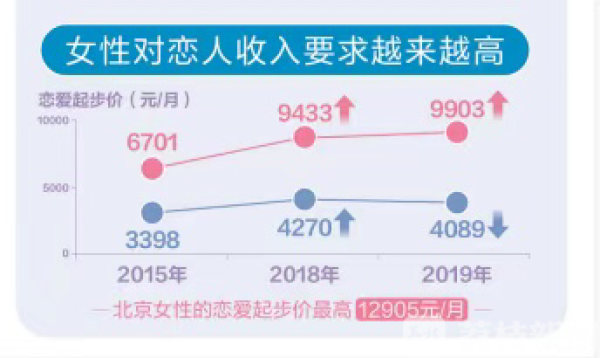 “婚恋观报告”显示,爱情的“起步价”逐年提高,职场单身女性对恋人的月收入期望,从2015年的平均6701元/月,升高至 2019年的平均9903元/月,其中北京女性以12905元/月位列第一;而今年男性的目标相对2018年反而下降,平均为4089元/月,不足女性的一半。