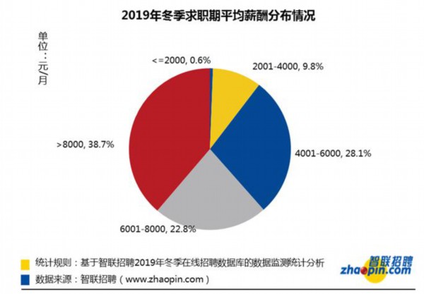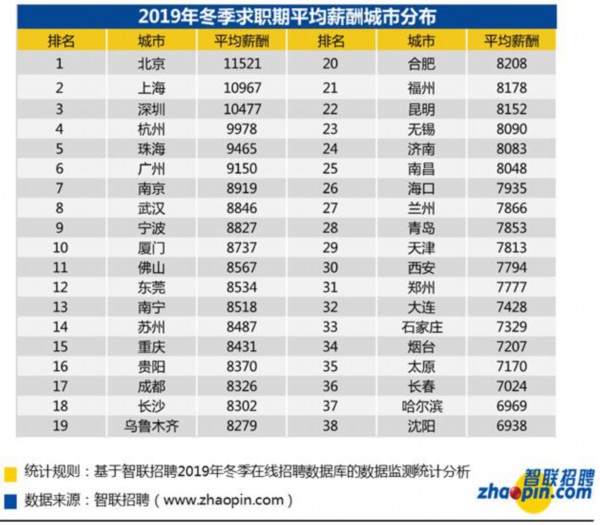 智联招聘发布的报告显示,2019年冬季,全国38个主要城市的平均招聘薪酬为8829元/月,本季度平均薪酬绝对值环比上升1.5%,同比涨幅为9.1%。