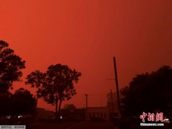 澳大利亚维多利亚州马拉库塔的天空被山火映红,数以千计的当地居民和度假游客收到撤离通知。