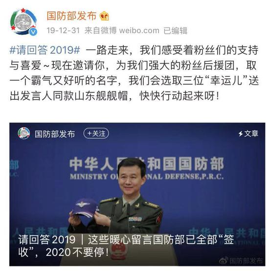 中国青年报(ID:zqbcyol)发现,@国防部发布 跨年抽奖的礼物正是这款舰帽。。。。。。吴谦大校同款,激不激动!