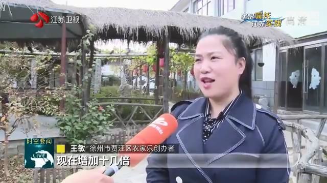 徐州市贾汪区农家乐创办者王敏说:“带动我们这些村民创业致富,一年收入原来几万元,现在增加十几倍,收入50-60万元。”