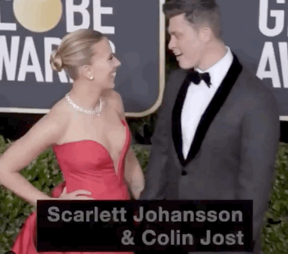“寡姐” Scarlett Johansson 一袭红裙携男友Colin Jost甜蜜相视