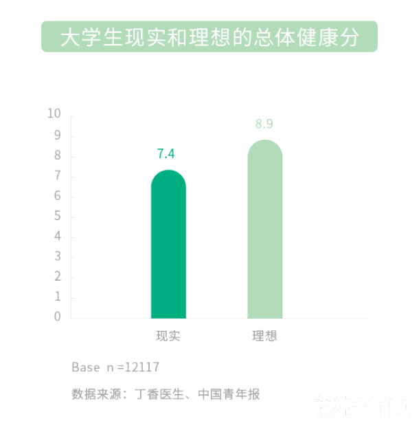 数据显示,88%的大学生健康自评分数超过了6分的及格线,总体健康自评平均分为 7.4 分,其中半数大学生打分更是达到 8 分及以上。