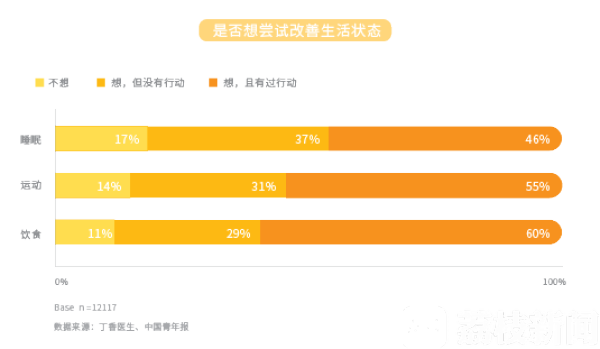 而在睡眠方面,34%的男生和47%的女生都有过睡眠困扰,尤其是大四之后,越来越多的大学生选择主动晚睡,硕博士中有一半人睡眠不足。有79%的大学生上床后不会立刻睡觉。同时调查发现,60%的大学生会主动采取行动改善自身健康状况,但相比饮食和运动,尝试过改善睡眠的大学生比例最低。