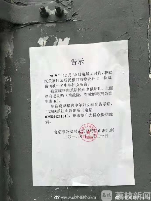 近日,江苏南京玄武区红山派出所的民警们为找一块咸肉着急了。原来,2019年12月30日,辖区内一块含有老鼠药的咸猪肉被一名中年妇女所盗。红山派出所表示:希望该中年妇女看到告示后,主动联系派出所,也希望广大群众提供线索。