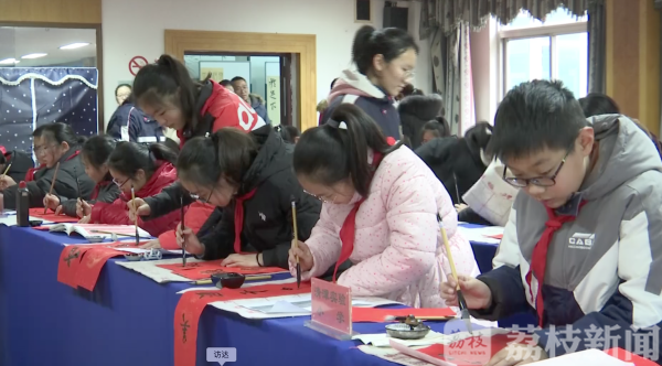 这位正在书写的女生是常州市清潭实验小学的阮柯晴,她学习书法已经3年了,刚通过国家书法等级10级的考试。和阮柯晴、徐欣艺一起受邀参加常州市兰陵中学“书法节”活动的,还有100多位来自常州其他中小学校的书法爱好者。学生们将自己书写的百副书法作品赠送给了自己的书法老师,以表达学生对恩师的新年祝福。