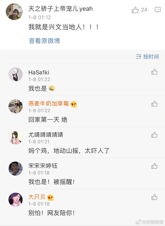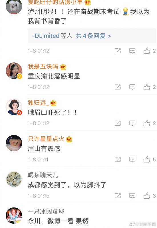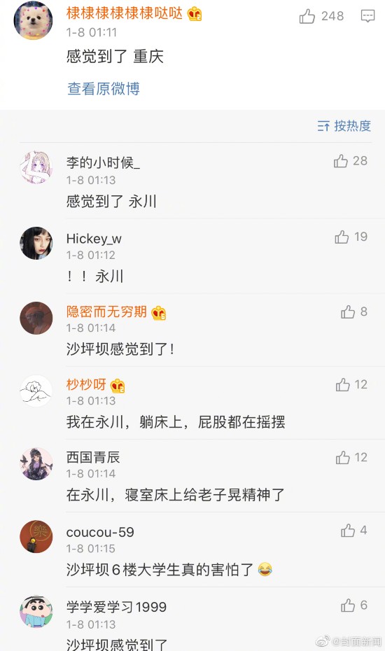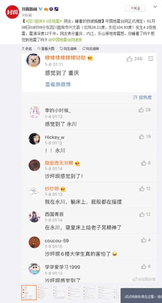 中国地震台网正式测定:01月08日01时09分在四川宜宾市兴文县(北纬28.21度,东经104.93度)发生4.1级地震,震源深度12千米。网友表示重庆、内江、乐山等地有震感,你睡着了吗?感觉到地震了吗?
