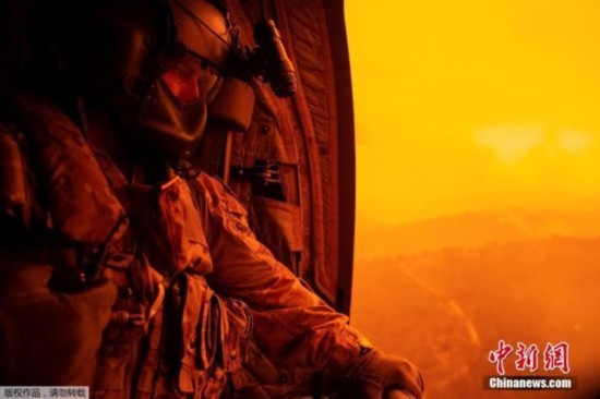 当地时间1月4日,澳大利亚陆军第5航空中队的2级准尉达雷尔·罗参与“林火救援”行动期间,乘坐CH-47F奇努克号机飞维多利亚州奥米奥。