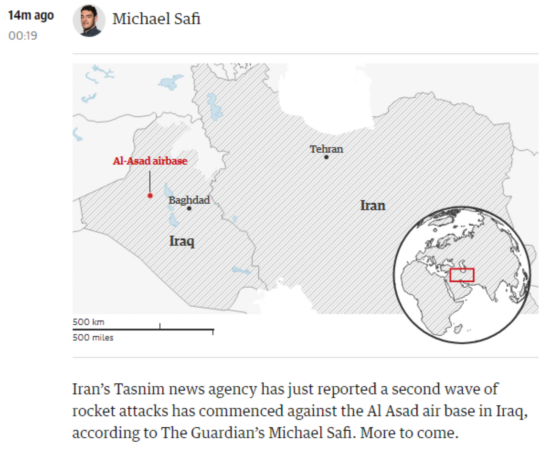 多家外媒刚刚集中报道了一则重大突发消息:当地时间8日早晨,美军驻伊拉克“阿萨德空军基地”遭多枚火箭弹袭击。随后,伊朗伊斯兰革命卫队立即发表声明,证实其以“数十枚地对地导弹”袭击美军基地。法新社称,这一袭击是伊拉克亲伊朗势力对美军杀死苏莱曼尼将军的“回应”。此外,五角大楼也证实,伊朗向驻伊拉克的美军和国际联军发射了”弹道导弹“。