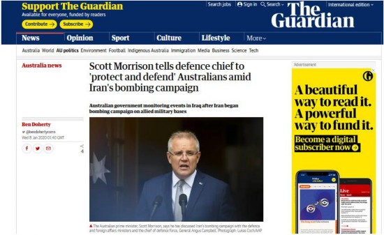 伊朗空袭美军基地后,澳大利亚也提高了警惕。英国《卫报》最新消息称,澳大利亚总理斯科特 莫里森要求该国国防部长“采取一切必要行动”保护在伊拉克的澳大利亚人安全。