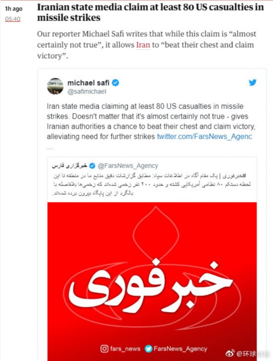 针对今天早上伊朗对美军基地发起的导弹袭击,伊朗法尔斯新闻社援引伊朗情报机构官员消息称,美军阿萨德基地内至少有80名美国军人被杀、200人受伤,空袭还摧毁了美军多架无人机和直升机。美国CNN则称美军在本次袭击中“零伤亡”。
