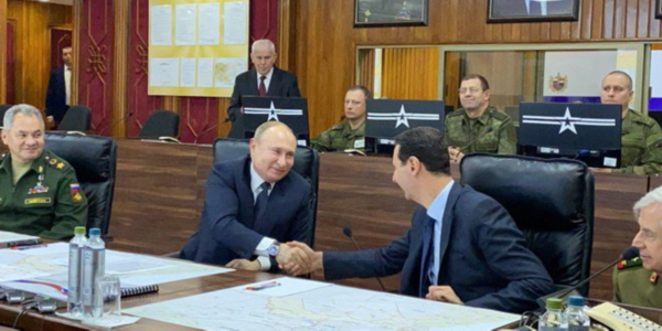 普京和巴沙尔见面的地方是俄罗斯军事指挥中心,就在大马士革的中心地带。叙利亚官方通讯社说,两人一共碰头了两次,其中一次是闭门会议。双方谈及的话题有伊德利卜、土耳其在叙北的行动、反恐和中东局势。