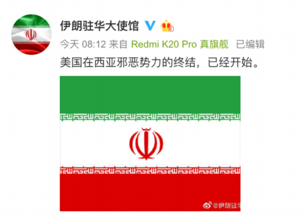 就在昨晚,伊朗驻华大使馆微博贴出了一张伊朗国旗,文字描述:“美国在西亚邪恶势力的终结,已经开始。”