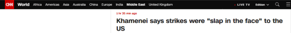 CNN说,哈梅内伊在当天的讲话中表示,伊朗“昨晚给了美国一记耳光……(但)这样的军事行动还不够。关键在于,美国的存在’是这个地区腐败的根源,这样的情况应该被终结。”CNN解释说,这位伊朗最高领袖所指的“一记耳光”正是伊朗8日凌晨向驻有美军的伊拉克军事基地发射数十枚导弹一事。