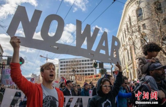 当地时间1月4日,两千多人在旧金山市中心参加反战集会,谴责美国总统特朗普下令炸死伊朗将领苏莱马尼,并要求特朗普政府从中东撤军,以和平的方式解决国际争端。中新社记者 刘关关 摄