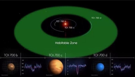 TOI 700d比地球大20%,从恒星获得的能量约为地球所接收太阳能的86%,这意味着它位于恒星TOI 700的宜居带中。科学家们观测发现700d存在潮汐锁定现象,类似于月球,永远以同一面朝着恒星,不似地球一样还会自转,所以很可能不会存在昼夜交替,也不会有春夏秋冬。它的气候和地球完全不同,虽然存在诞生生命的条件,但只是出位于“宜居区域”,并不一定完全适宜生存。