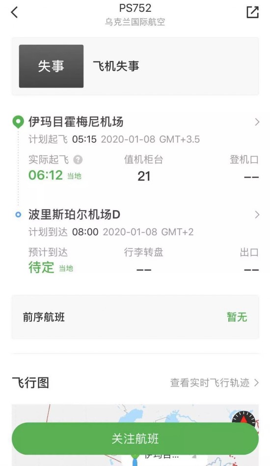 根据乌克兰通讯社的消息,失事飞机航班号为PS752,从德黑兰起飞,原定目的地是乌克兰基辅。伊朗紧急服务组织负责人库里万德表示,飞机失事时已经起火。