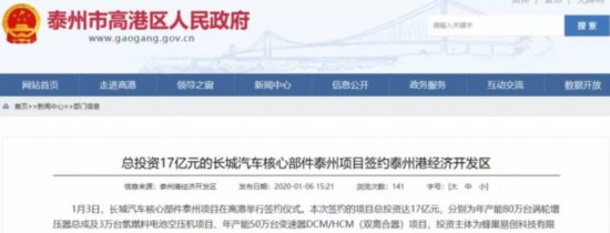 1月3日,长城汽车核心部件泰州项目举行签约仪式,正式落户泰州港经济开发区。