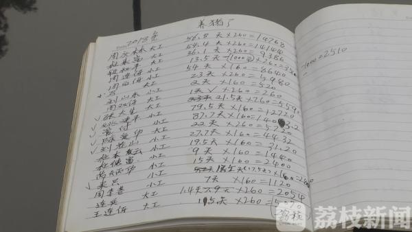 大工260元一天,小工160元一天,在曹师傅的这个本子上,记录着他和二十多位乡亲给一家养猪场做修缮工作的工作量,2018年和2019年两年时间的工钱一共是18.6万元。曹师傅说,他和其他的二十多位乡亲都是南京市溧水区白马镇的农民,在两年时间里断断续续地给当地的一家养猪场修房、铺路,这十几万元都是他们的辛苦钱。