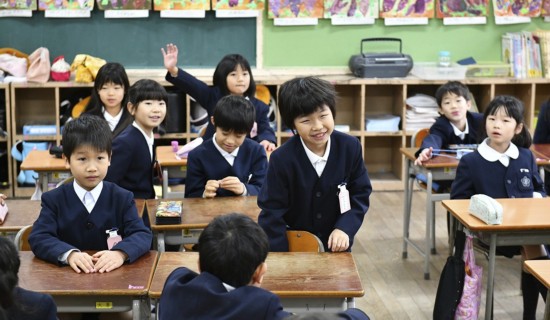 卡米南部小学(Kaminanbu Elementary School)的孩子们向老师展示寒假作业。