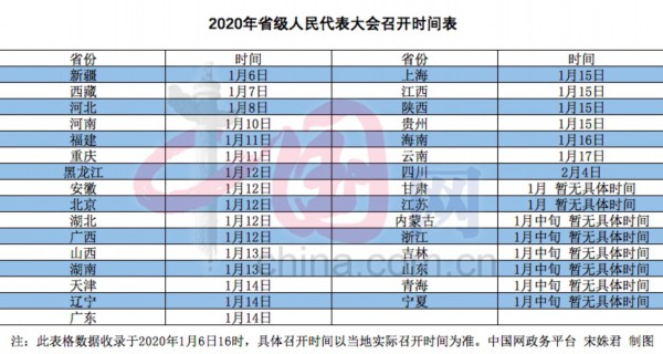 中国网北京1月7日讯 1月5日,新疆维吾尔自治区政协十二届三次会议召开。在刚刚结束的2020年第一个周末,今年的省级“两会”正式拉开帷幕。从下图可以看出,今年的省级“两会”主要集中在1月中旬前后,新疆最早。