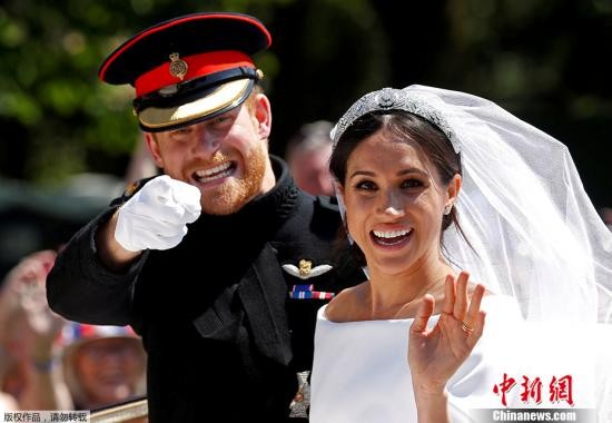 资料图:2018年5月19日,英国温莎城堡圣乔治教堂,哈里王子大婚,仪式结束后和妻子梅根坐在马车上。DAMIR SAGOLJ