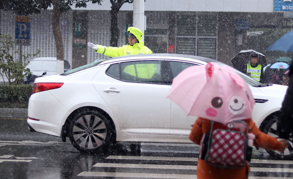 今天(1月9日)上午7点多钟开始,句容城区的雪越下越大,纷纷扬扬的雪花在空中飞舞。由于路面雨雪混杂,十分湿滑,路上来往的车辆明显放慢了速度,有序通过路口。在句容市实验小学北门路口,记者看到:“护学岗”交警正站在路口执勤,指挥车辆、行人有序通过。