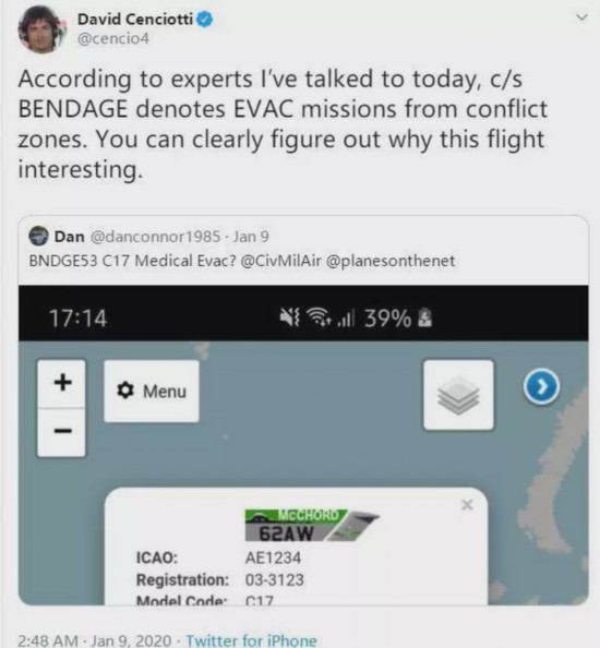 航空专家、前意大利空军军官戴维·森乔蒂(David Cenciotti)也在社交媒体上称,据他采访的专家介绍,这个航班号意味着其任务是从冲突地区撤离。