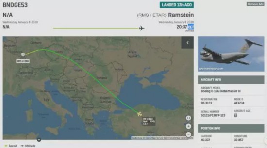 伊朗用导弹袭击美军驻伊拉克基地后,一架航班号为“BNDGE 53”的飞机引起了国外航空爱好者的注意。这架飞机是1月8日从伊拉克巴格达起飞,飞往德国拉姆斯泰因基地。根据航班号查询可知,此为美国空军的一架C-17A运输机,编号为03-3123。国外多名军事与航空爱好者称其为“医疗飞机”。