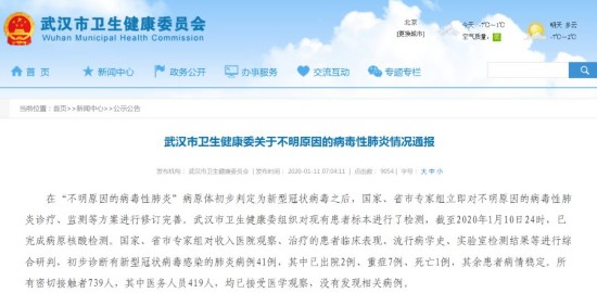 武汉市卫生健康委今晨发布通报称,在“不明原因的病毒性肺炎”病原体初步判定为新型冠状病毒之后,武汉卫健委组织对现有患者标本进行检测,截至1月10日24时,初步诊断有新型冠状病毒感染的肺炎病例41例,其中重症7例、死亡1例,其余患者病情稳定。