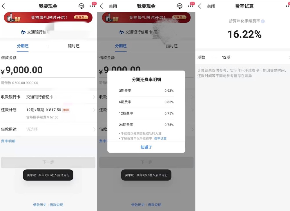 此外,中新经纬记者在交通银行买单吧APP上选择某借款产品时发现,只有点击还款计划后,跳转至分期还款率明细,再点击费率试算,才能找到真正的折算年化手续费率。