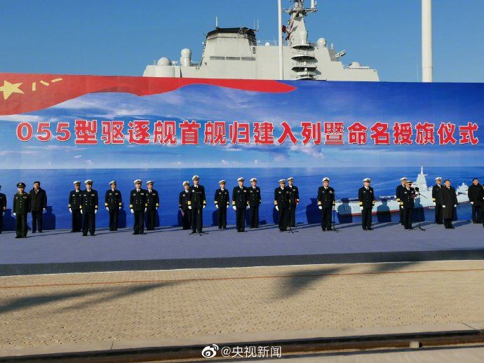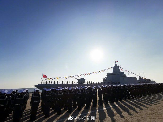 今天上午,海军055型驱逐舰首舰南昌舰归建入列仪式在青岛某军港码头举行。