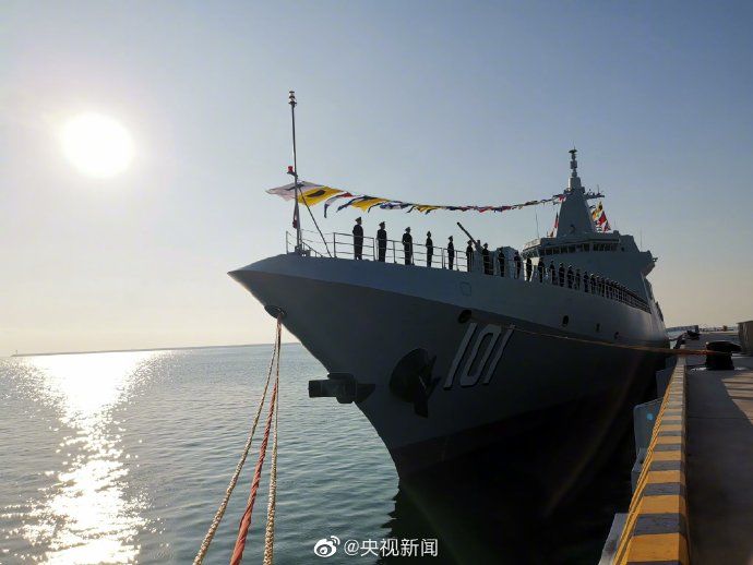 央视记者 王刚:这里是青岛某军港,舷号为101的南昌舰,在拖船的引导下,缓缓靠泊码头,这是2020年中国海军入列的首艘舰艇,也是中国海军首艘万吨大驱加入战斗序列。