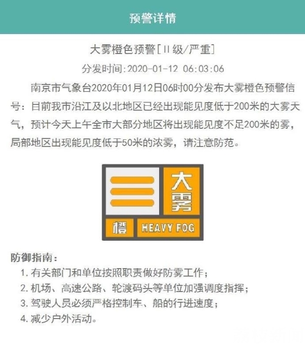 南京市气象台今天06时发布大雾橙色预警信号,南京市沿江及以北地区出现能见度低于200米的大雾天气。春运第三天,就碰上了大雾,给出行的旅客制造了一个不大不小的麻烦。1月12日一早,南京市沿江及以北地区已经出现能见度低于200米的大雾天气,上午南京全市大部分地区将出现能见度不足200米的雾,局部地区出现能见度低于50米的浓雾。