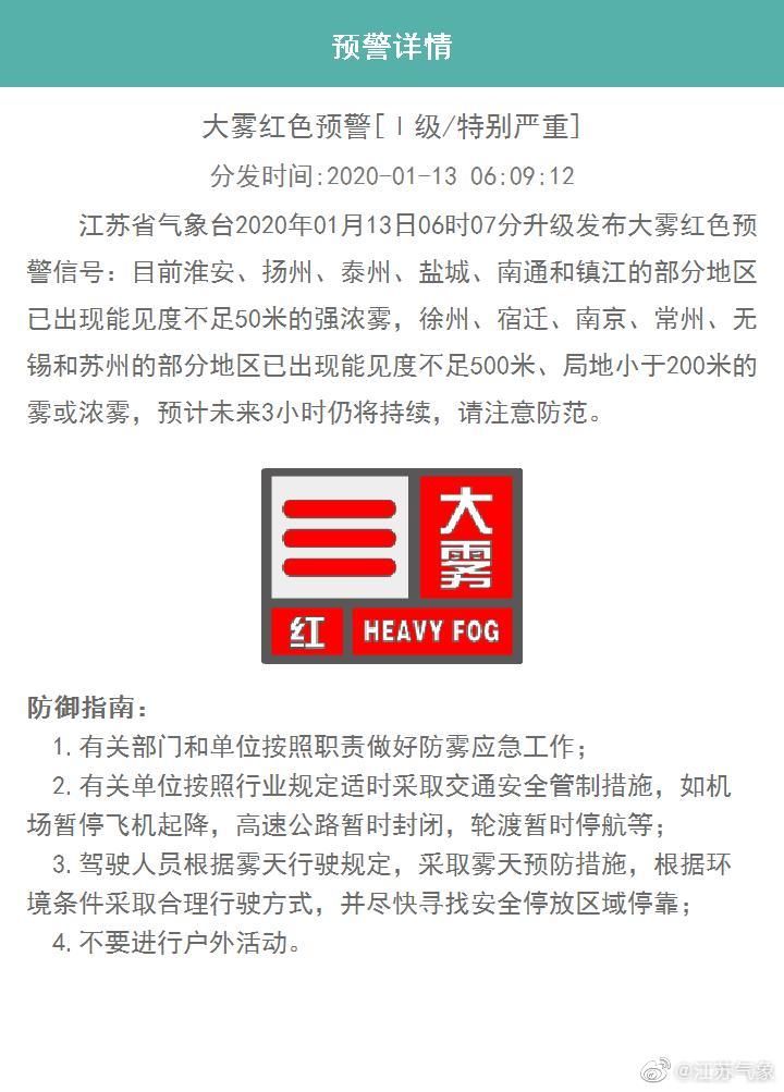 大雾红色预警:江苏省气象台2020年01月13日06时07分升级发布大雾红色预警信号:目前淮安、扬州、泰州、盐城、南通和镇江的部分地区已出现能见度不足50米的强浓雾,徐州、宿迁、南京、常州、无锡和苏州的部分地区已出现能见度不足500米、局地小于200米的雾或浓雾,预计未来3小时仍将持续,请注意防范。