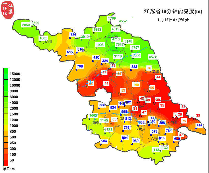 天气实况:1月13日6:50,目前淮安、扬州、泰州、盐城、南通和镇江的部分地区能见度仍不足50米,提醒大家注意出行安全。