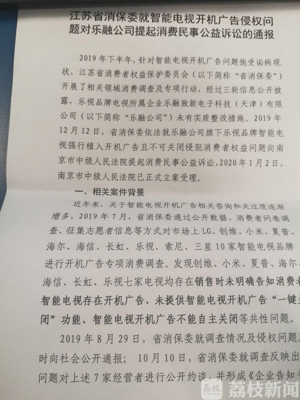 2019年下半年,针对智能电视开机广告问题饱受诟病现状,江苏省消费者权益保护委员会开展了相关领域消费调查及专项行动,经过三轮信息公开披露,仍有个别企业未有实质整改措施。今天(1月13日)上午,省消保委向媒体通报了事件进展。