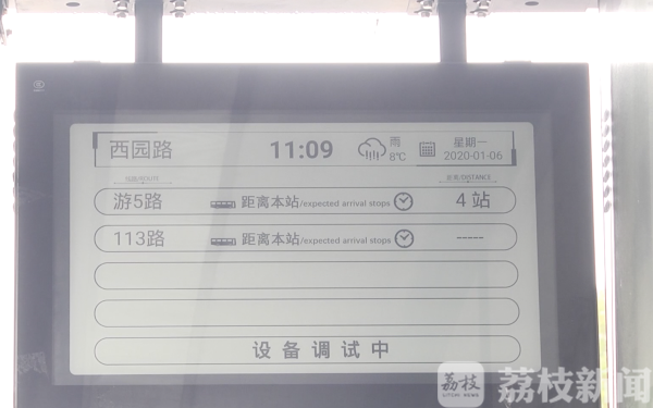 在连云港市连云区的一个公交站点,记者看到很多正在等车的市民都在观看新的显示屏,虽然还处于调试阶段,但他们对显示屏的节能环保以及服务功能称赞不已:“上边有天气预报功能,然后可以准确地知道今天的天气啊。晴啊,什么都挺好的,方便。”