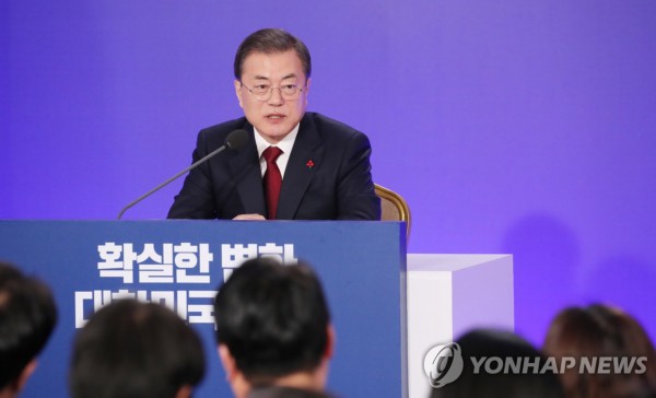 14日,文在寅举行新年记者会。(韩联社)